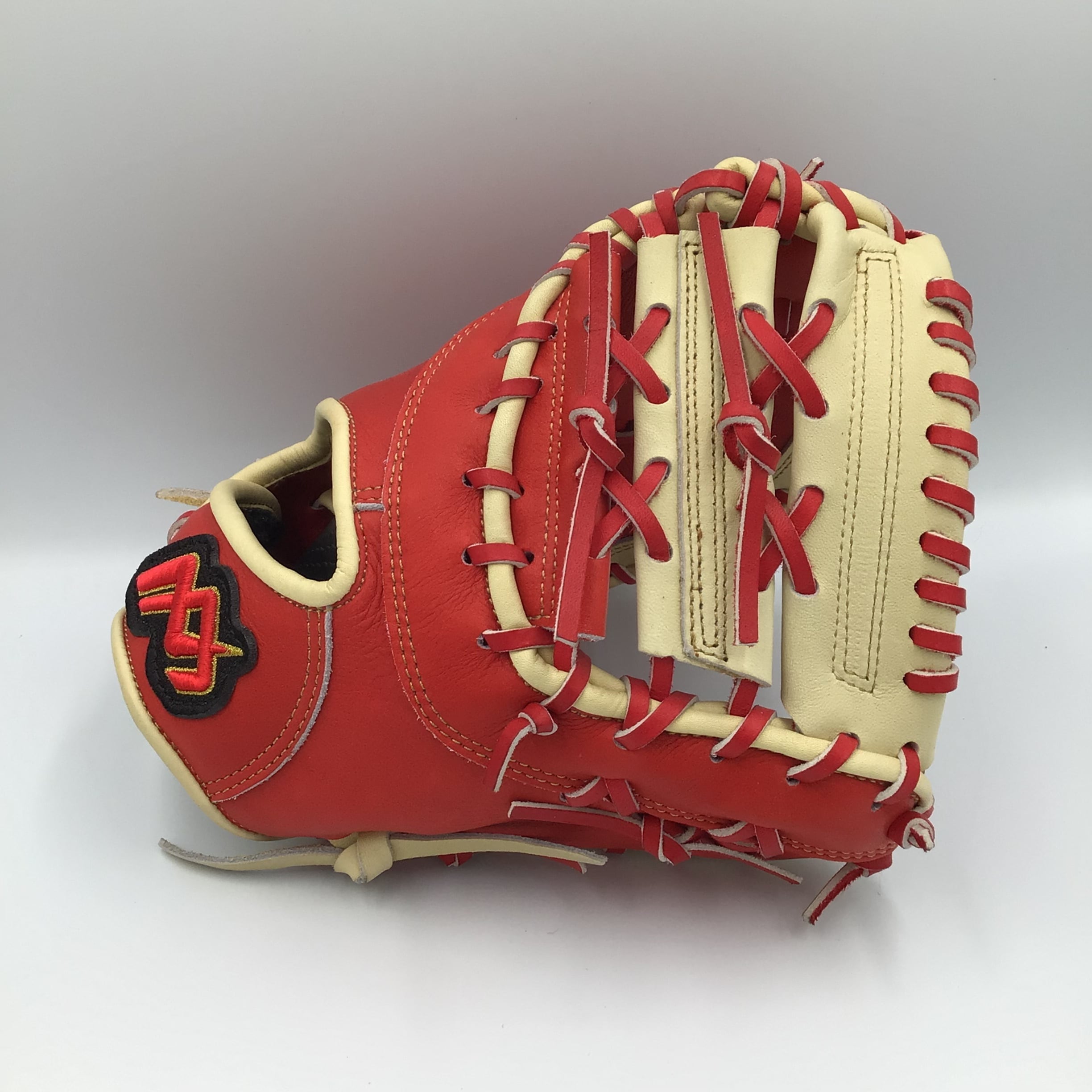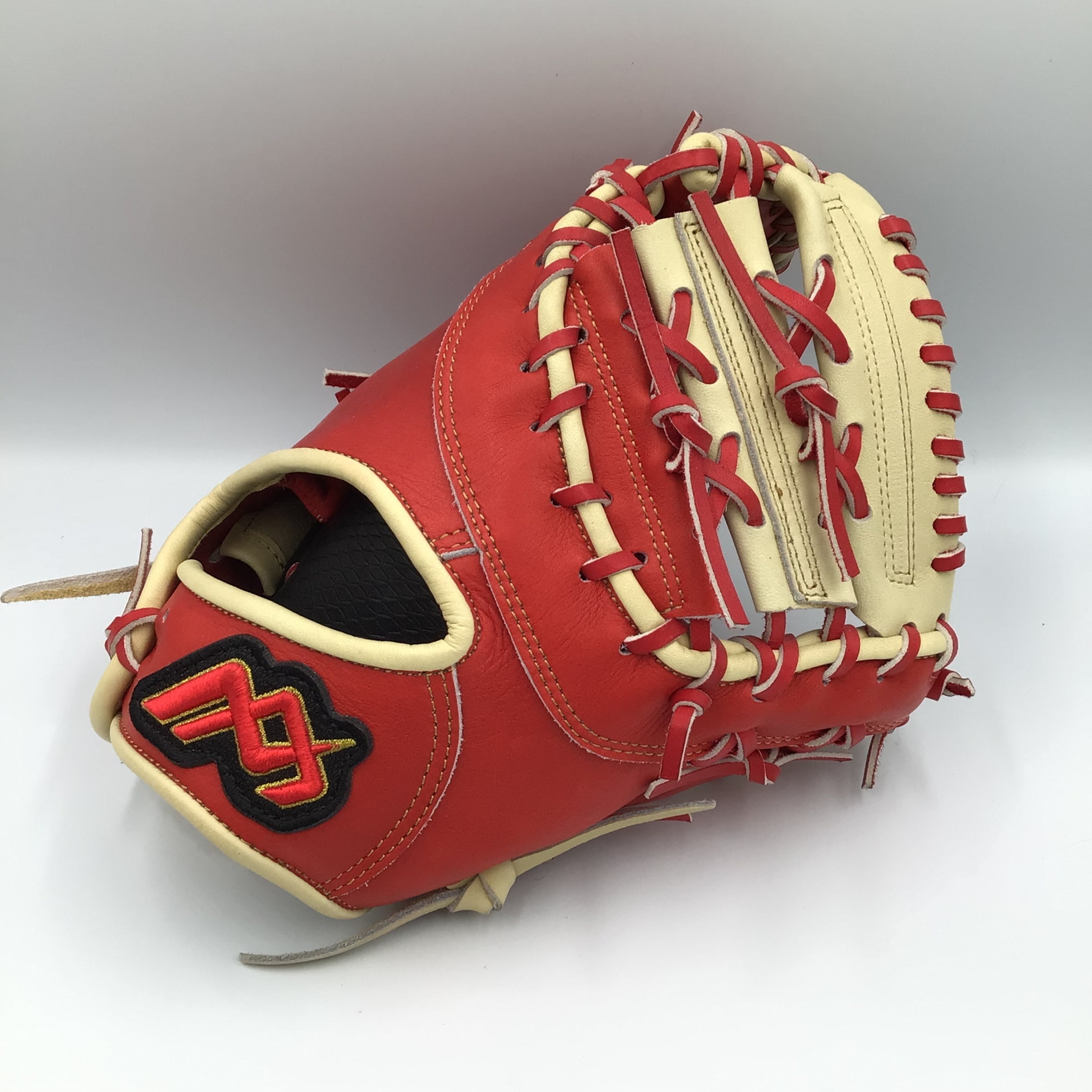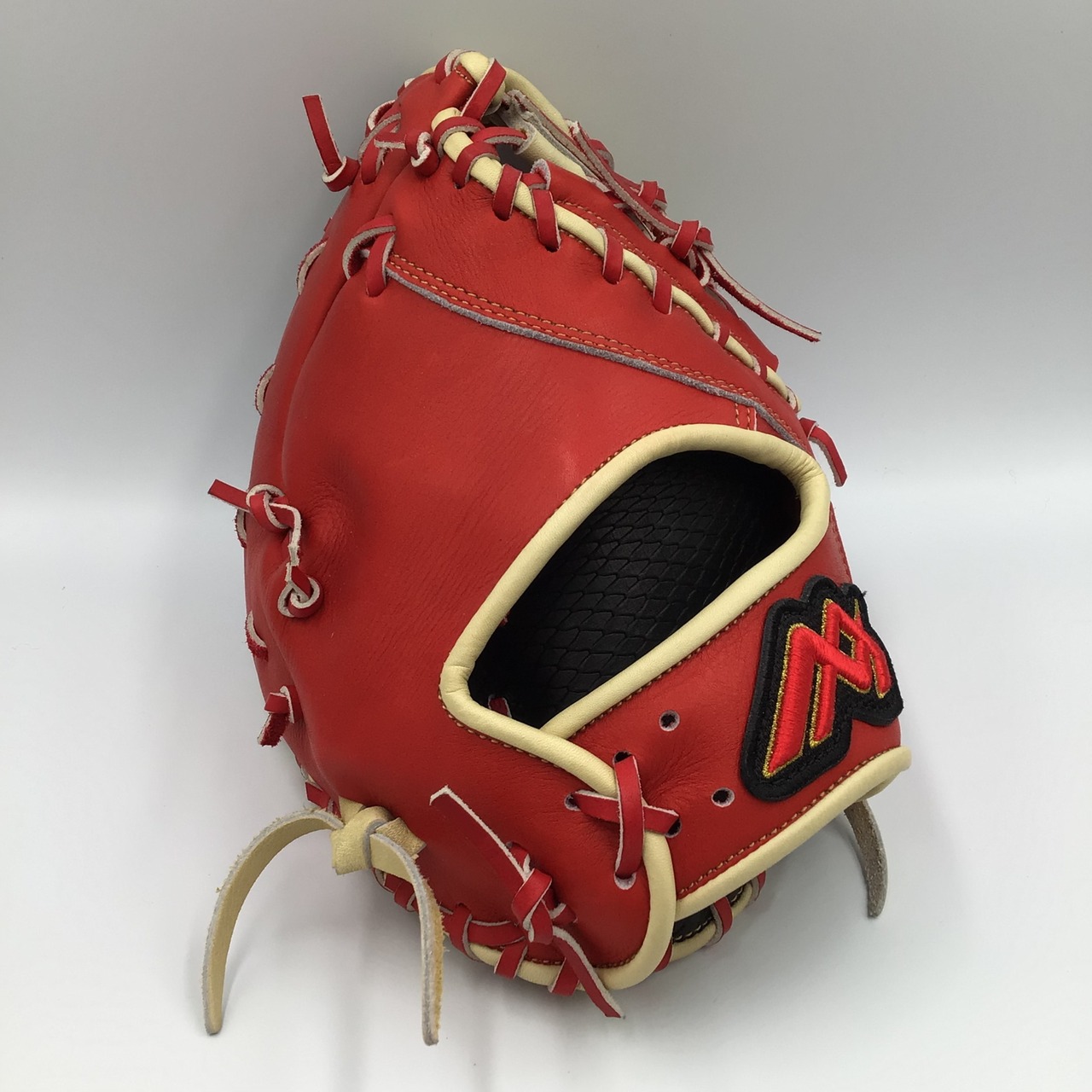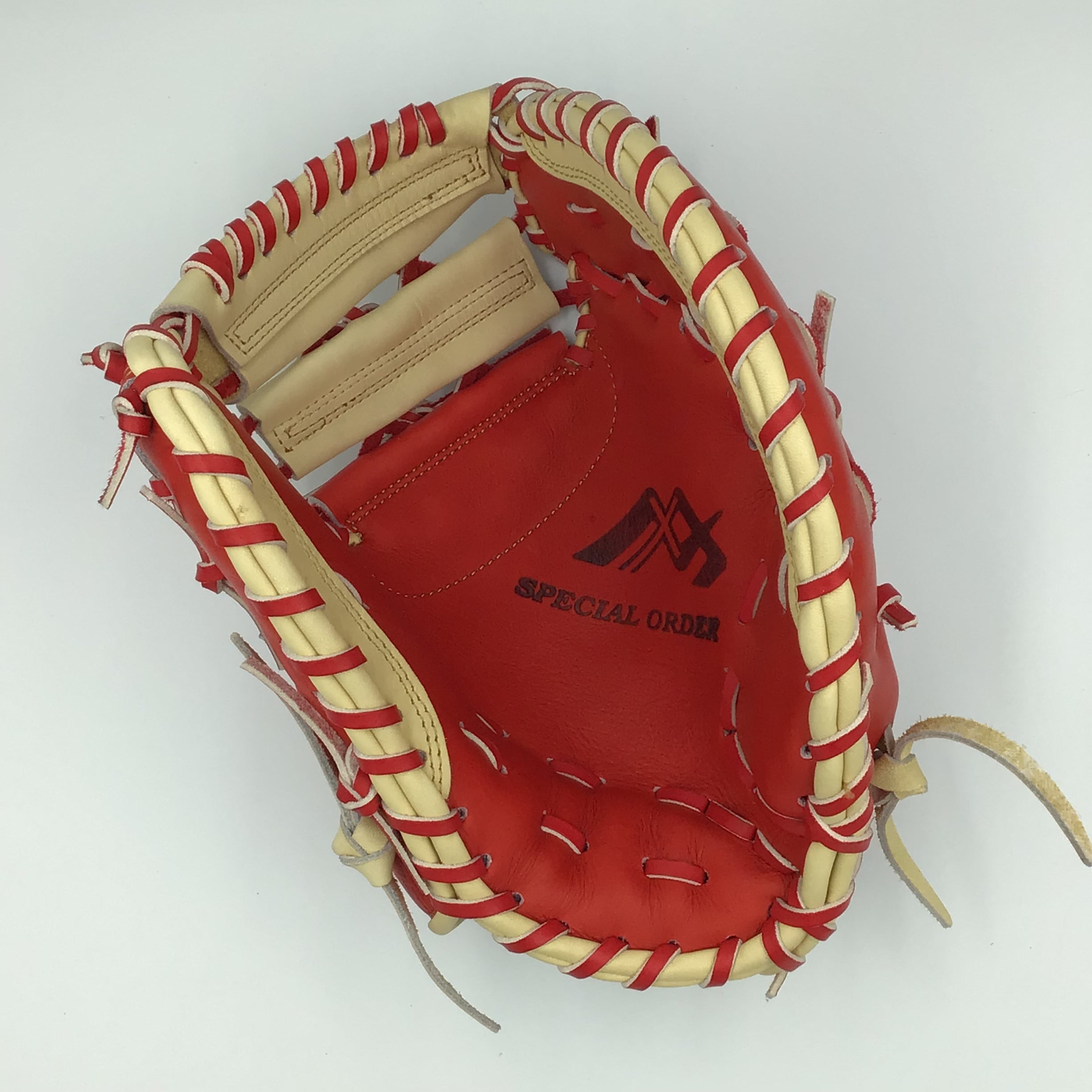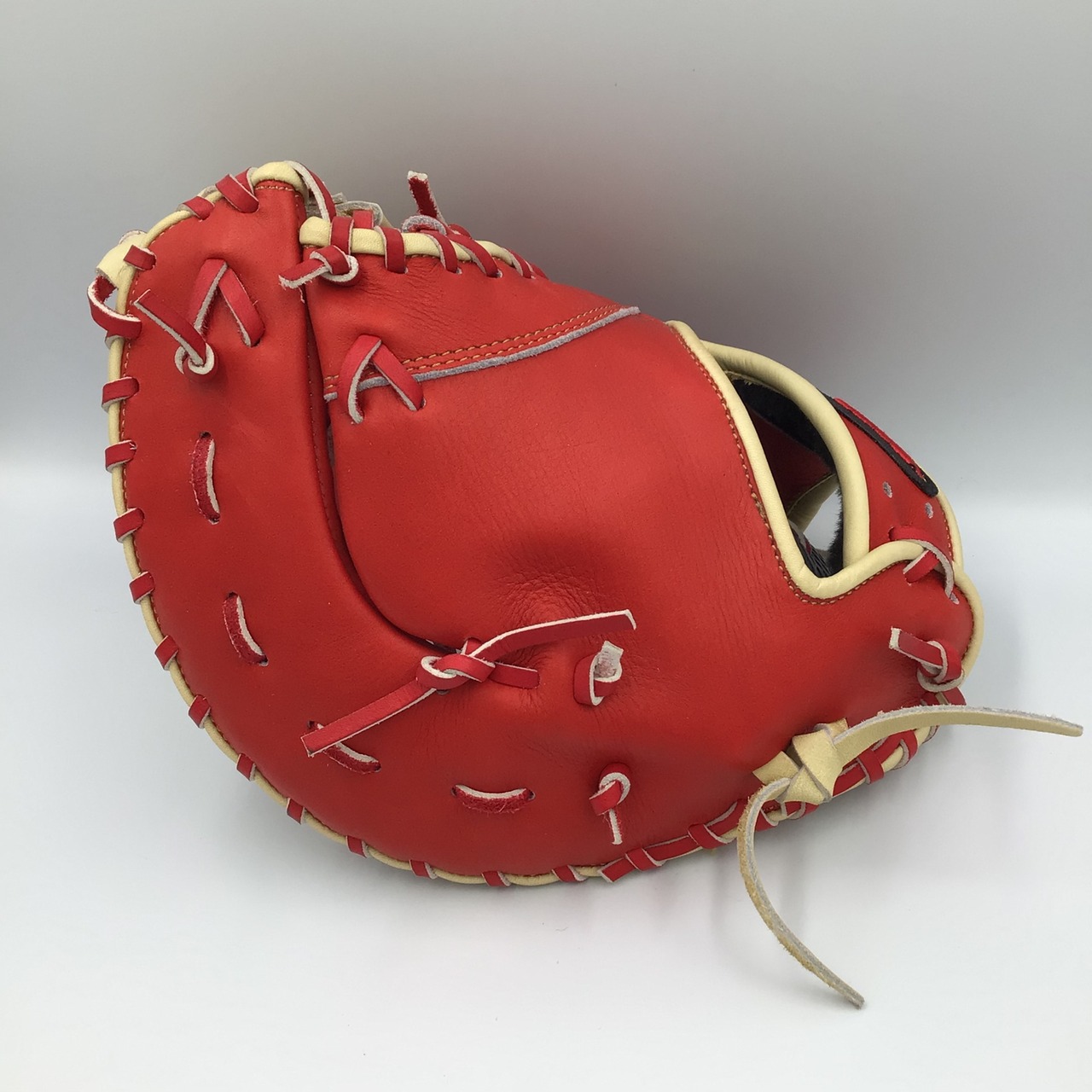 小学生向けソフトボール捕手用です。革 ステアの柔らかい赤を使用、捕球面ターゲット・ウェブはキャメルを使用。投手から見やすく、投げやすいこと間違いなしです。ヒラ裏にスケールレザー使用してます。
