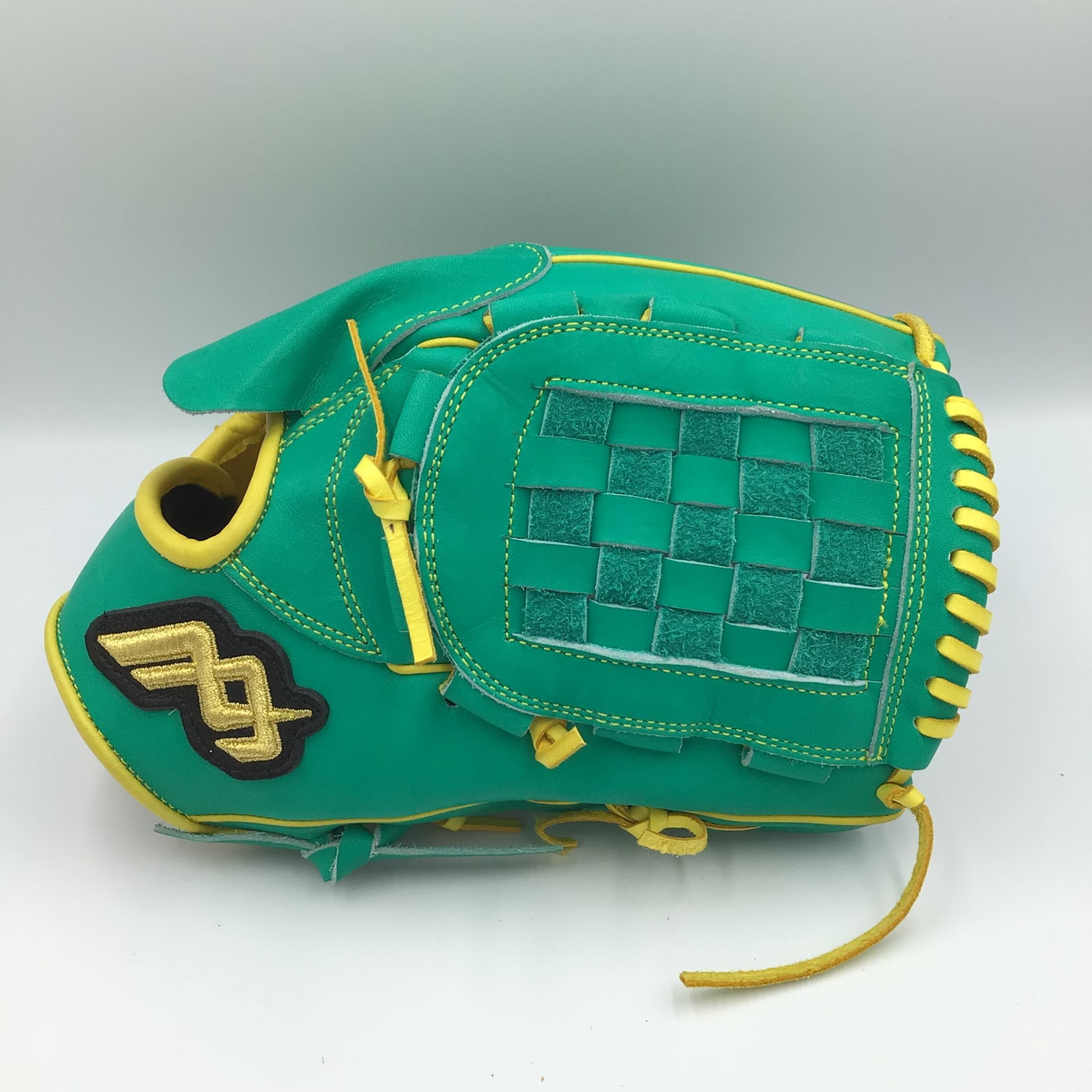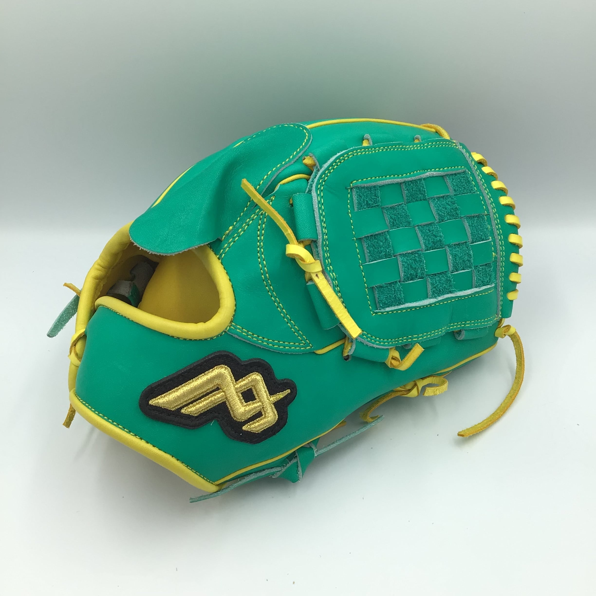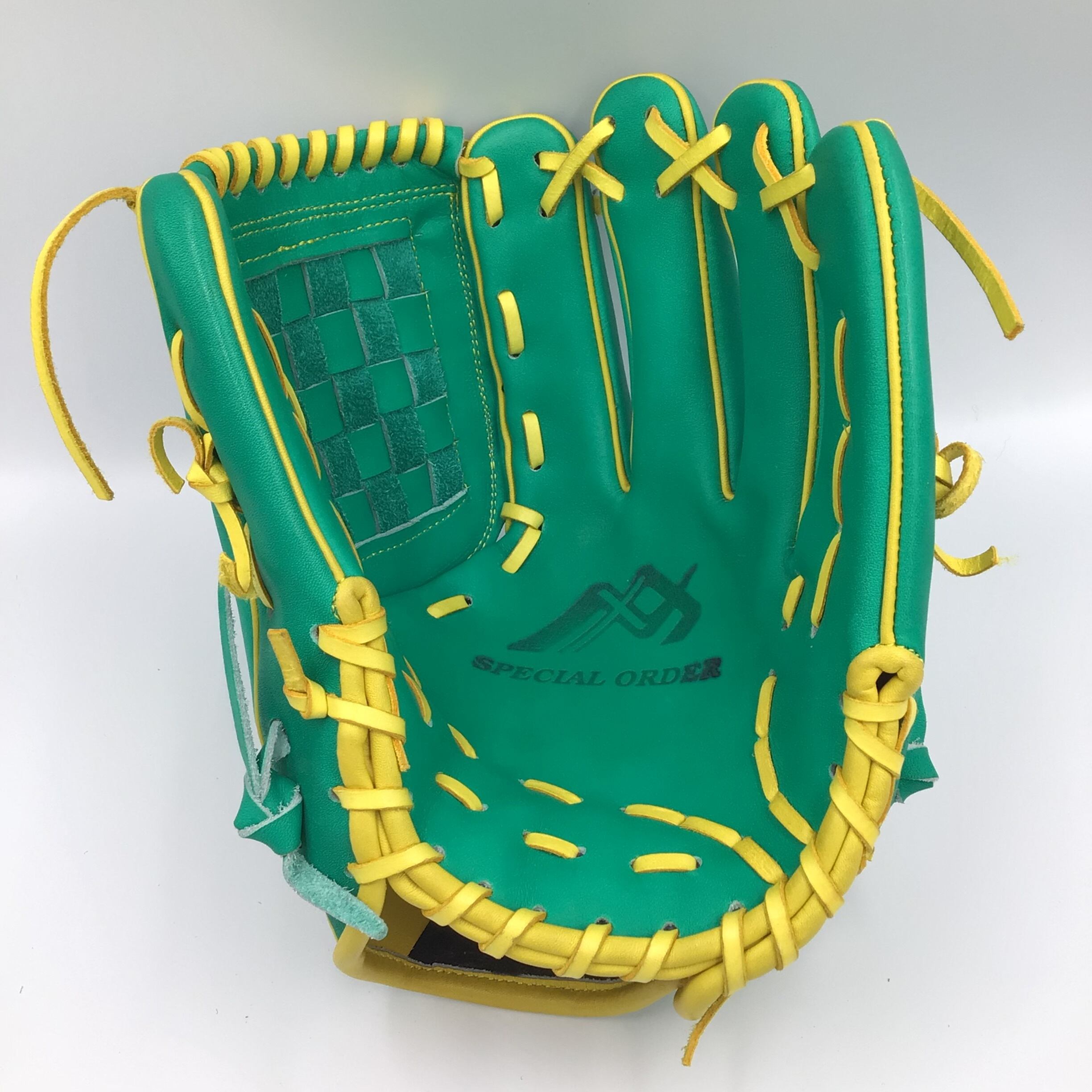 軟式投手用です。縦型の深めのポケットで、安定感抜群です。革 ステアのマリナーズグリーン